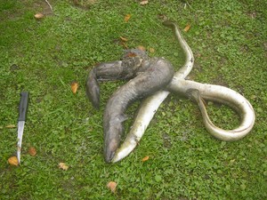 Vous devrez en effet, après le ferrage sortir d’autorité les anguilles, avant qu’elles ne se réfugient dans un herbier, s’enroulent autour d’une branche morte ou ne cherchent refuge dans une anfractuosité de rocher. Un bas de ligne en 30/100 est une nécessité. Comme taille d’hameçon, les n° 6 à 8 conviennent parfaitement. A défaut de vers, des poissonnets morts type vairon ou petit goujon feront parfaitement l’affaire. Pour les grosses anguilles, la pêche au vif est de plus très moderne .